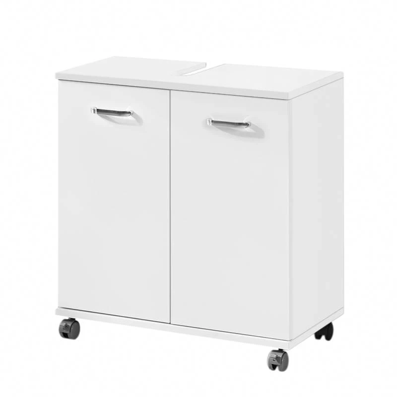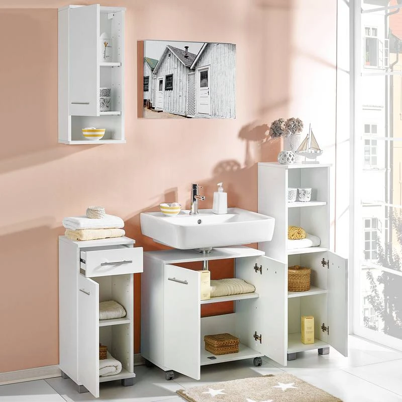 - 1 meuble sous vasque : 2 portes renfermant 1 tablette d’étagère et 4 roulettes