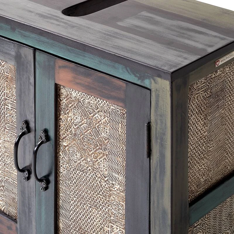 - Eléments de la façade : panneau MDF (panneau de fibres de bois de densité moyenne) avec éléments décoratifs métalliques