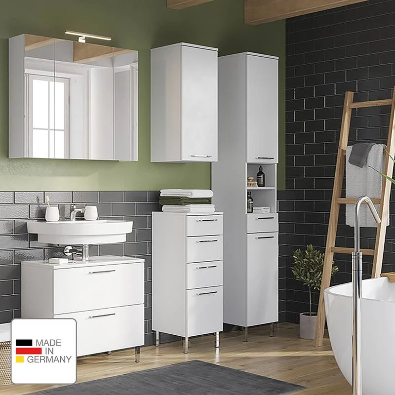 - Contenu de la livraison : Ensemble de salle de bain comprenant 1 meuble sous lavabo, 1 meuble haut, 1 meuble bas, 1 colonne de salle de bain et 1 armoire de toilette avec éclairage et combinaison interrupteur et prise