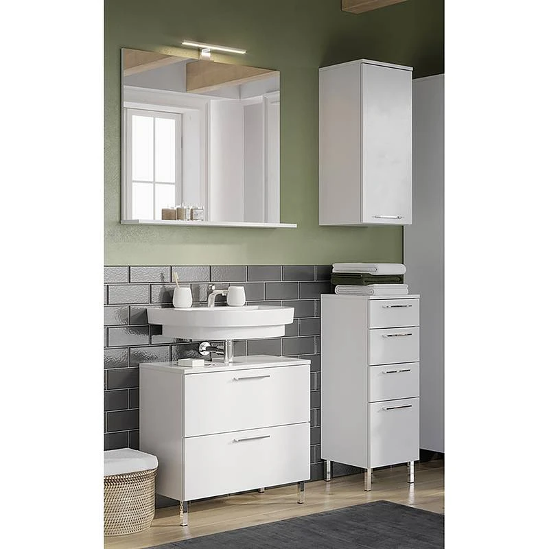 - Contenu de la livraison : Salle de bain comprenant 1 meuble sous vasque, 1 miroir avec éclairage inclus, 1 armoire murale et 1 meuble bas, sans accessoires