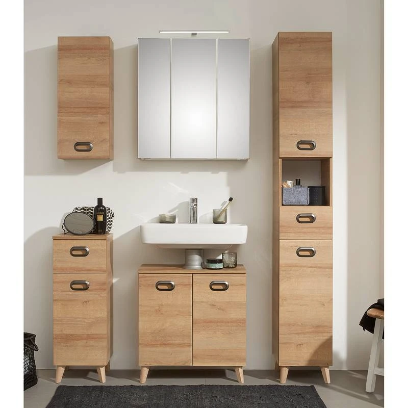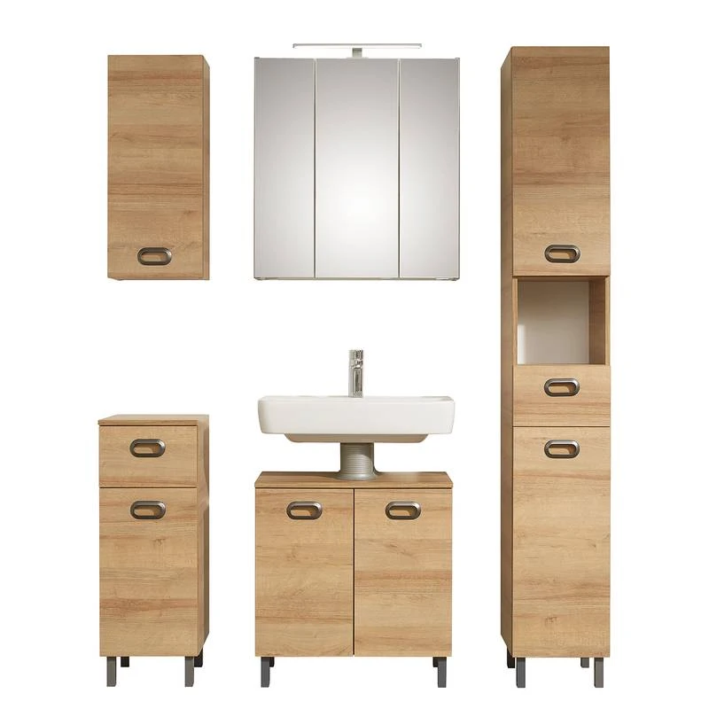 - Contenu de la livraison : Ensemble de salle de bain comprenant 1 meuble sous lavabo, 1 colonne de salle de bain, 1 meuble bas, 1 meuble haut et 1 armoire de toilette avec éclairage