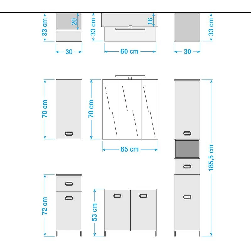 - Meuble haut (LxHxP) : 30 x 70 x 20 cm