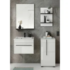 - Contenu de la livraison : Salle de bain comprenant 1 meuble avec vasque en fonte minérale, 1 meuble bas (charnières à droite), 1 étagère murale et 1 miroir