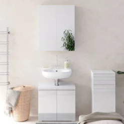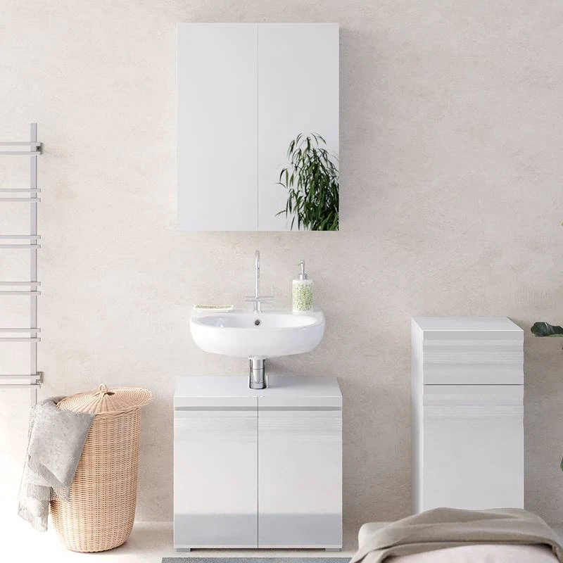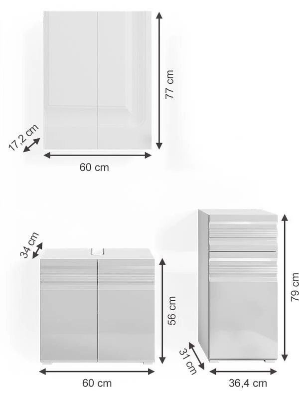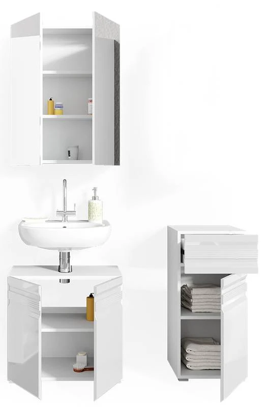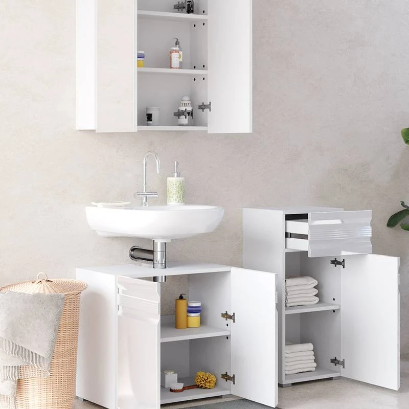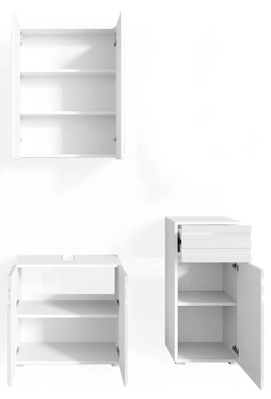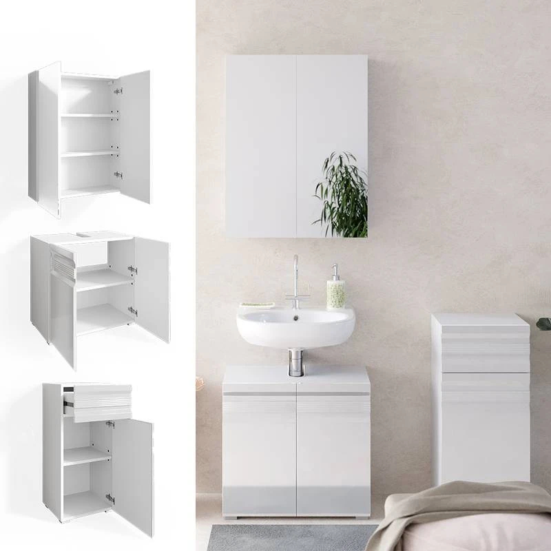 - Contenu de la livraison : Set 2 • 1x meuble sous-vasque • 1x armoire de toilette • 1x chiffonnier Décoration non incluse