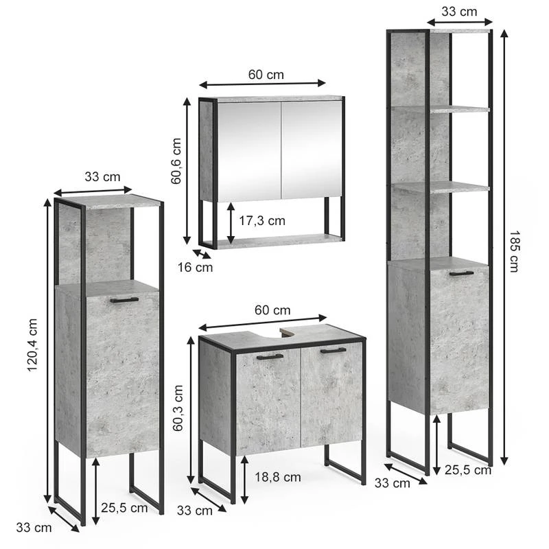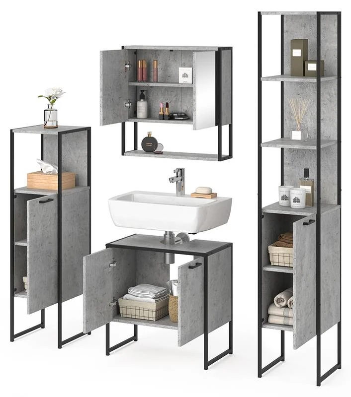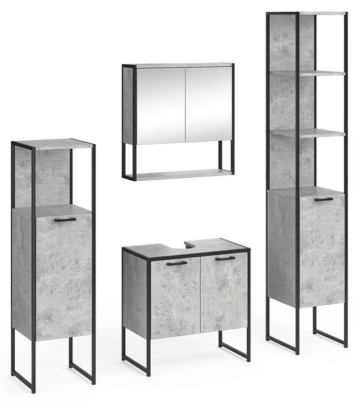 - Contenu de la livraison : • 1x armoire de toilette • 1x meuble sous-vasque • 1x étagère de salle de bains • 1x chiffonnier Décoration non incluse