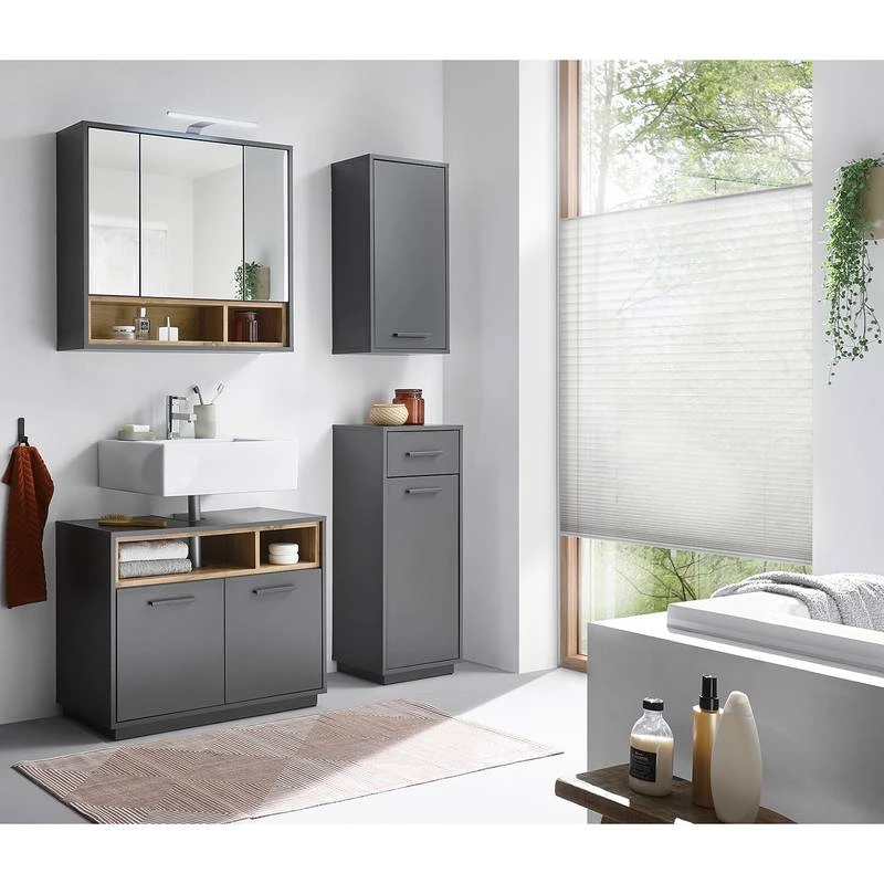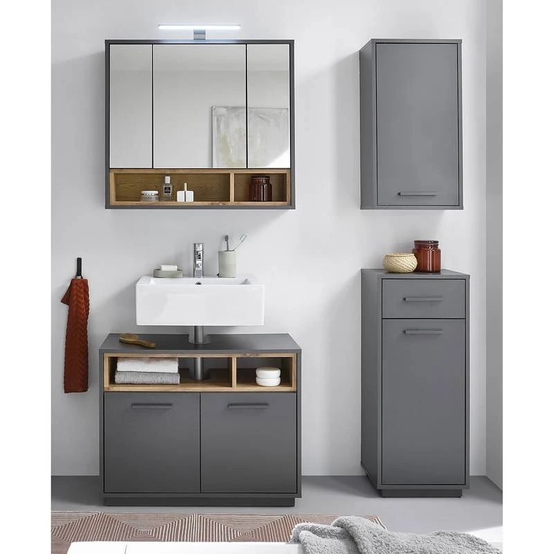 - Contenu de la livraison : Salle de bain comprenant 1 meuble sous lavabo, 1 meuble bas, 1 meuble haut et 1 armoire de toilette avec éclairage LED, interrupteur et prise (température de couleur : blanc froid)
