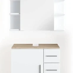 - Contenu de la livraison : • 1x armoire de toilette • 1x meuble sous-vasque Décoration non incluse