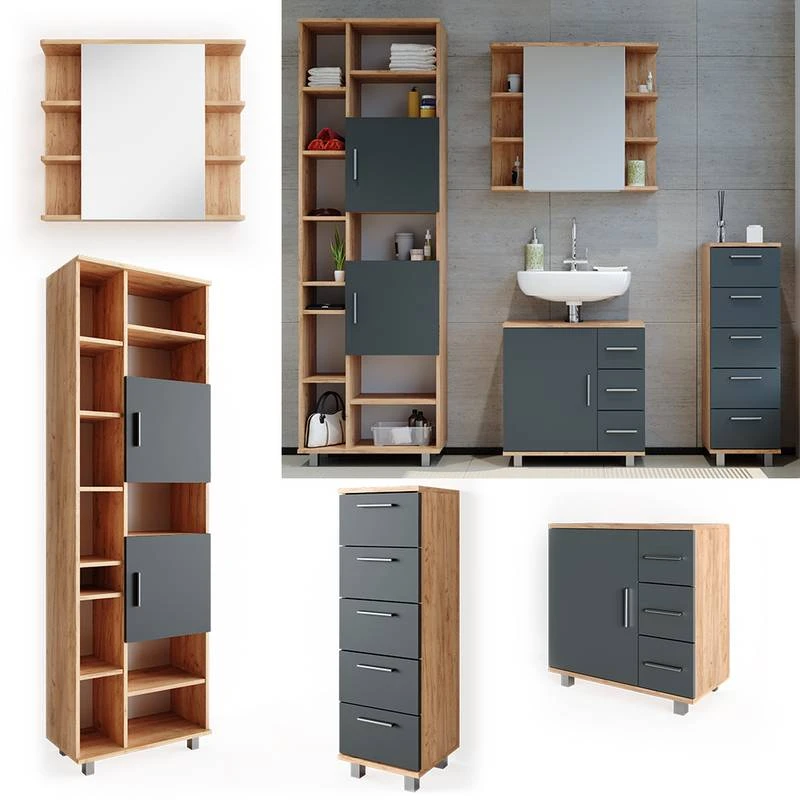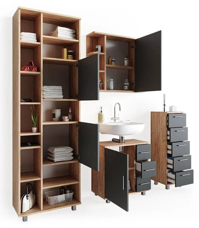 - Contenu de la livraison : • 1x armoire de toilette• 1x meuble sous-vasque• 1x chiffonnier• 1x meuble hautDécoration non incluse