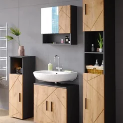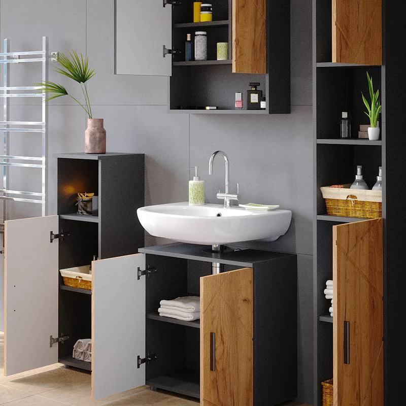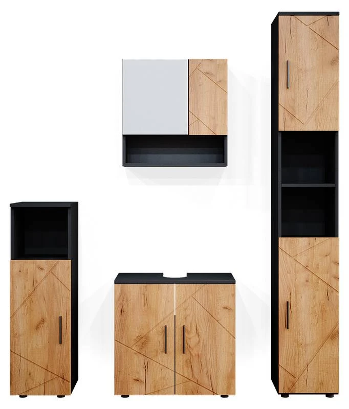 - Contenu de la livraison : • 1x meuble sous-vasque• 1x armoire de toilette • 1x chiffonnier• 1x meuble suspendu• 1x placardDécoration non incluse