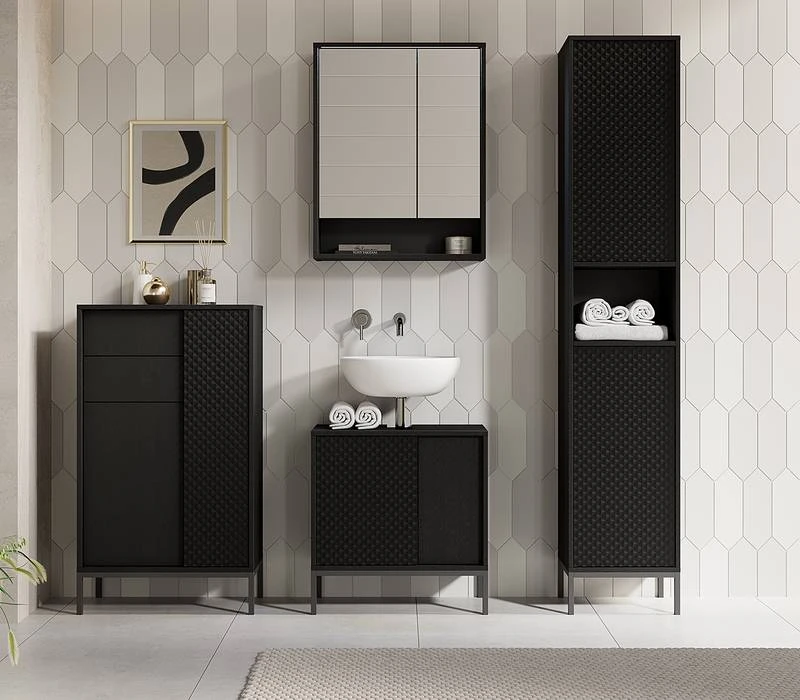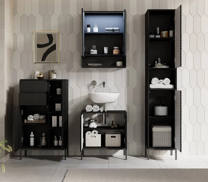 - Ensemble de salle de bain comprenant 1 meuble sous vasque, 1 colonne de salle de bain, 1 armoire midi et 1 armoire de toilette avec éclairage LED inclus