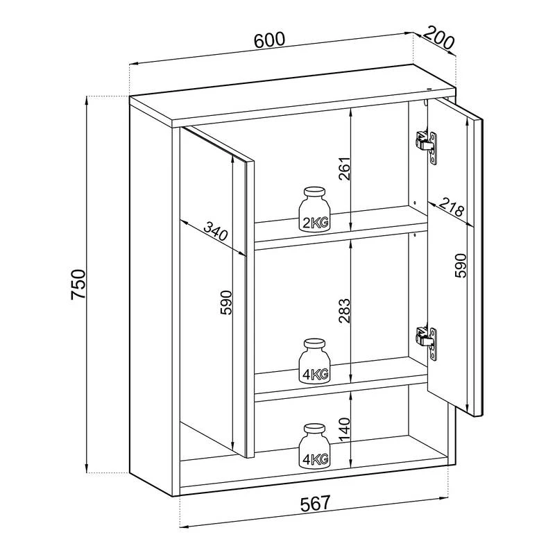 - Armoire de toilette (L x H x P) : 60 x 75 x 20 cm