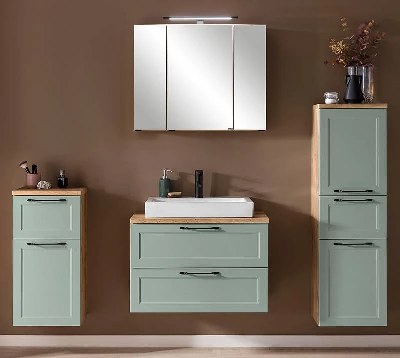 - Salle de bain comprenant 1 meuble avec vasque en céramique, 1 meuble bas, 1 colonne de salle de bain et 1 armoire de toilette avec éclairage intégré