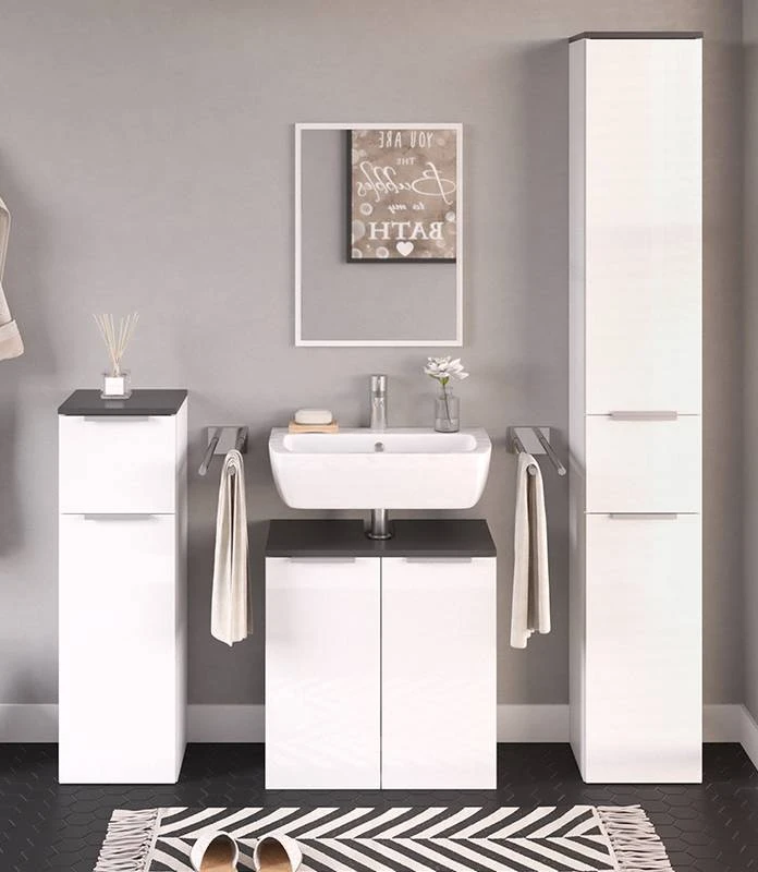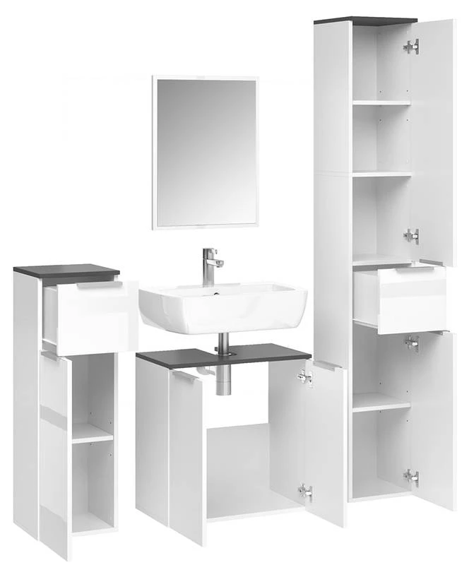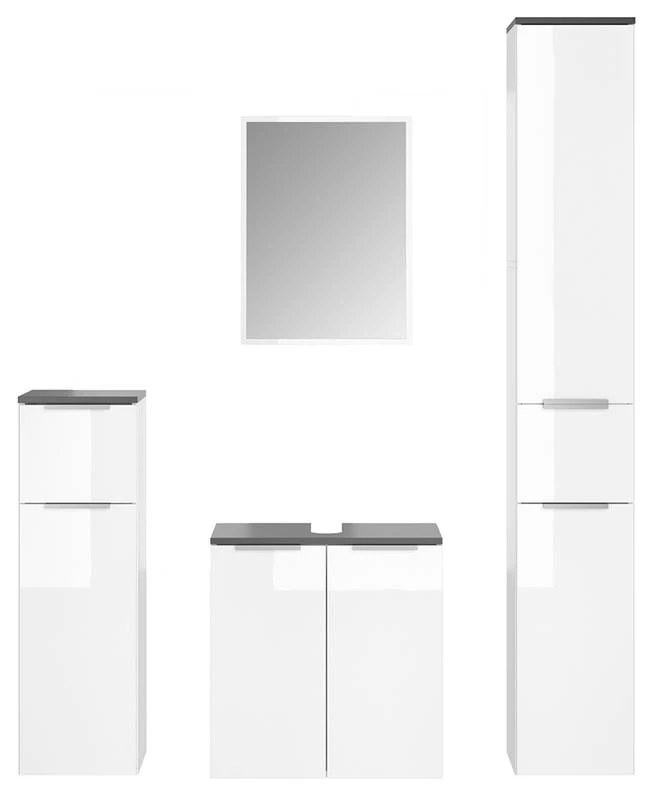 - Contenu de la livraison : Set 4 • 1x meuble sous-vasque • 1x chiffonnier • 1x meuble haut • 1x miroir Décoration non incluse