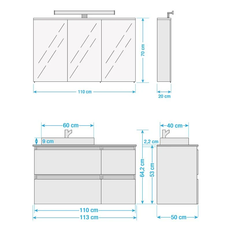 - Armoire de toilette (L x H x P) : 110 x 70 x 20 cm