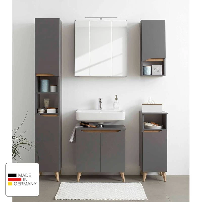 - Salle de bain comprenant 1 meuble bas, 1 meuble sous lavabo, 1 colonne de salle de bain, 1 armoire murale et 1 armoire de toilette avec éclairage