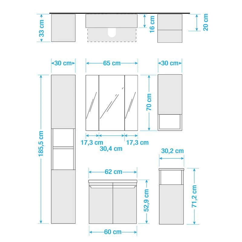- Armoire de toilette (LxHxP) : 65 x 70 x 16 cm