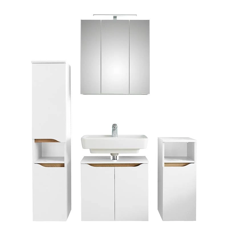 - Contenu de la livraison : Salle de bain comprenant 1 armoire de salle de bain, 1 armoire de toilette, 1 meuble sous lavabo et 1 meuble bas, avec éclairage inclus, sans pieds ni accessoires