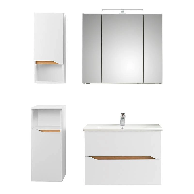 - Contenu de la livraison : Salle de bain comprenant 1 armoire de toilette avec éclairage inclus, 1 meuble avec vasque sans éclairage, 1 meuble haut et 1 meuble bas, sans accessoires