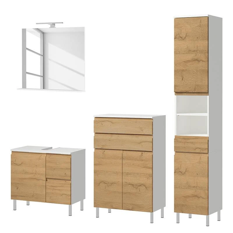 - Contenu de la livraison : Salle de bain comprenant 1 miroir avec éclairage, 1 meuble sous lavabo, 1 meuble bas et 1 colonne de salle de bain, sans accessoires