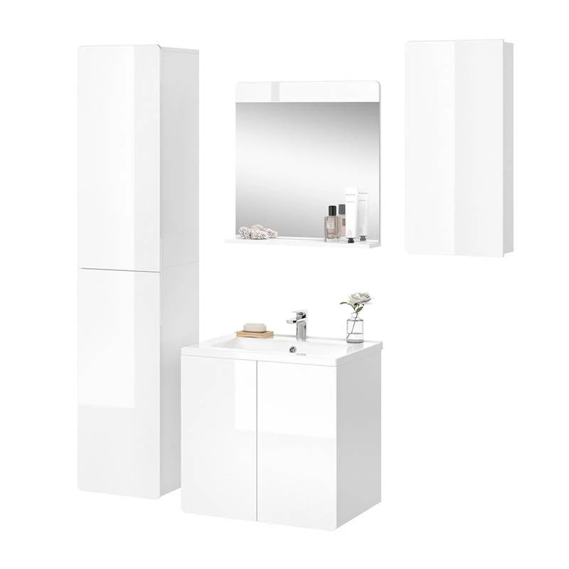 - Contenu de la livraison : • 1x meuble sous-vasque avec lavabo• 1x miroir de salle de bains • 1x meuble suspendu• 1x placardDécoration non incluse
